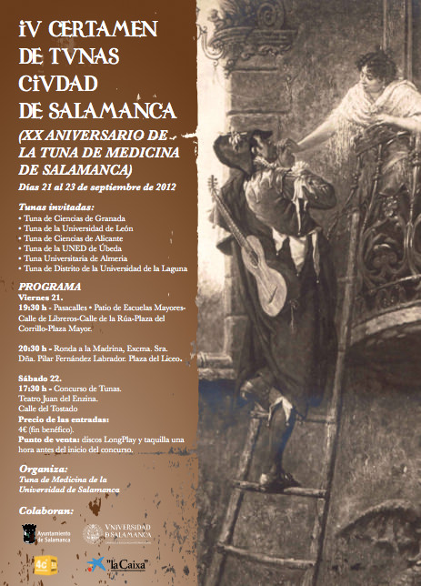 Justo antes de empezar el curso universitario, la Tuna de Ciencias de Granada participó en el IV Certamen de Tunas "Ciudad de Salamanca". Un festival especial por varios motivos: tiene lugar en una de las ciudades con más tradición universitaria, el nivel musical de los participantes es muy alto y lo organizan nuestros amigos de la Tuna de Medicina de Salamanca.